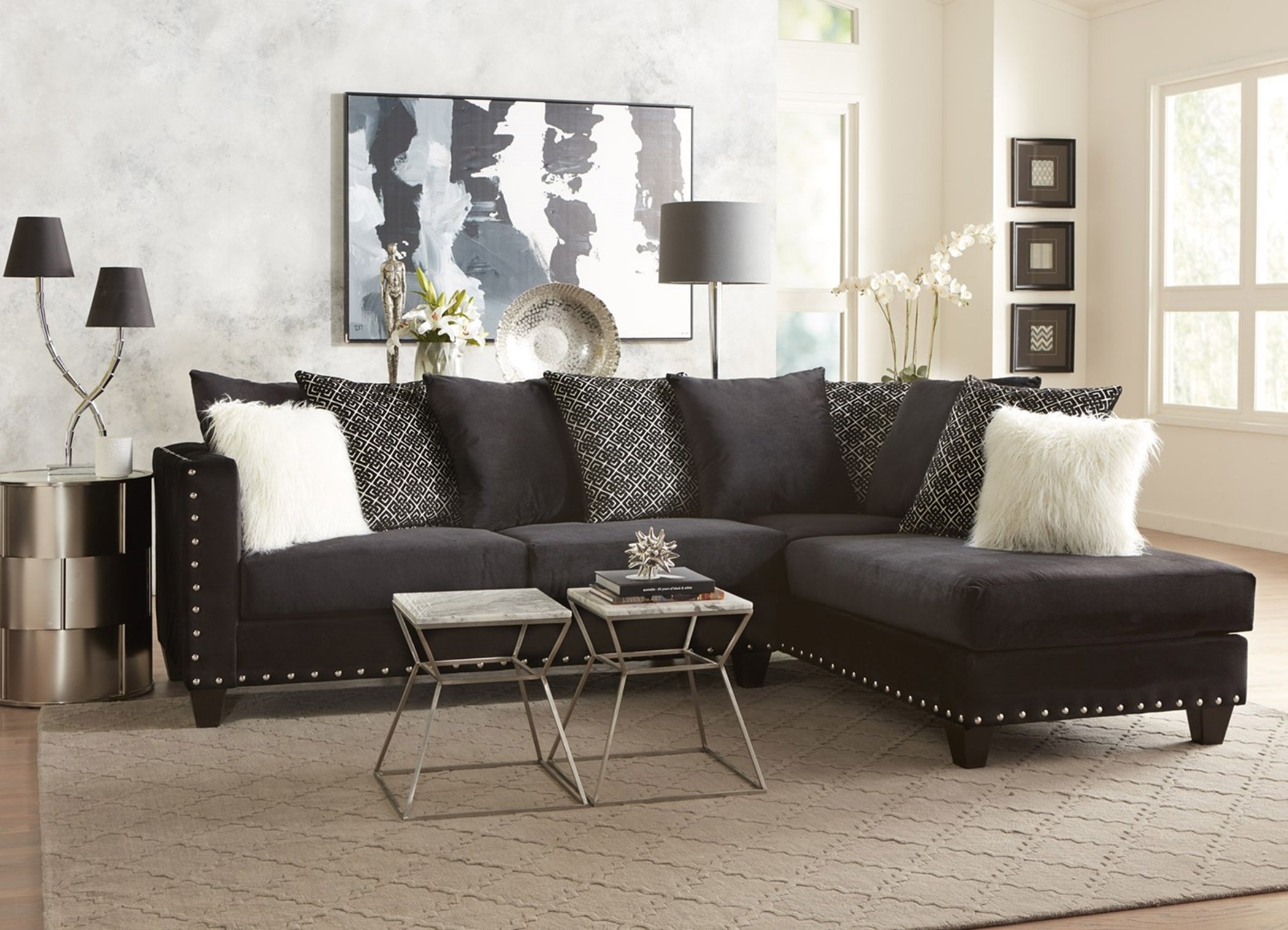 Super stylish affordable sectional features nailhead accents, with dark and tuxedo accent pillows. A unique group perfect for you open living room.