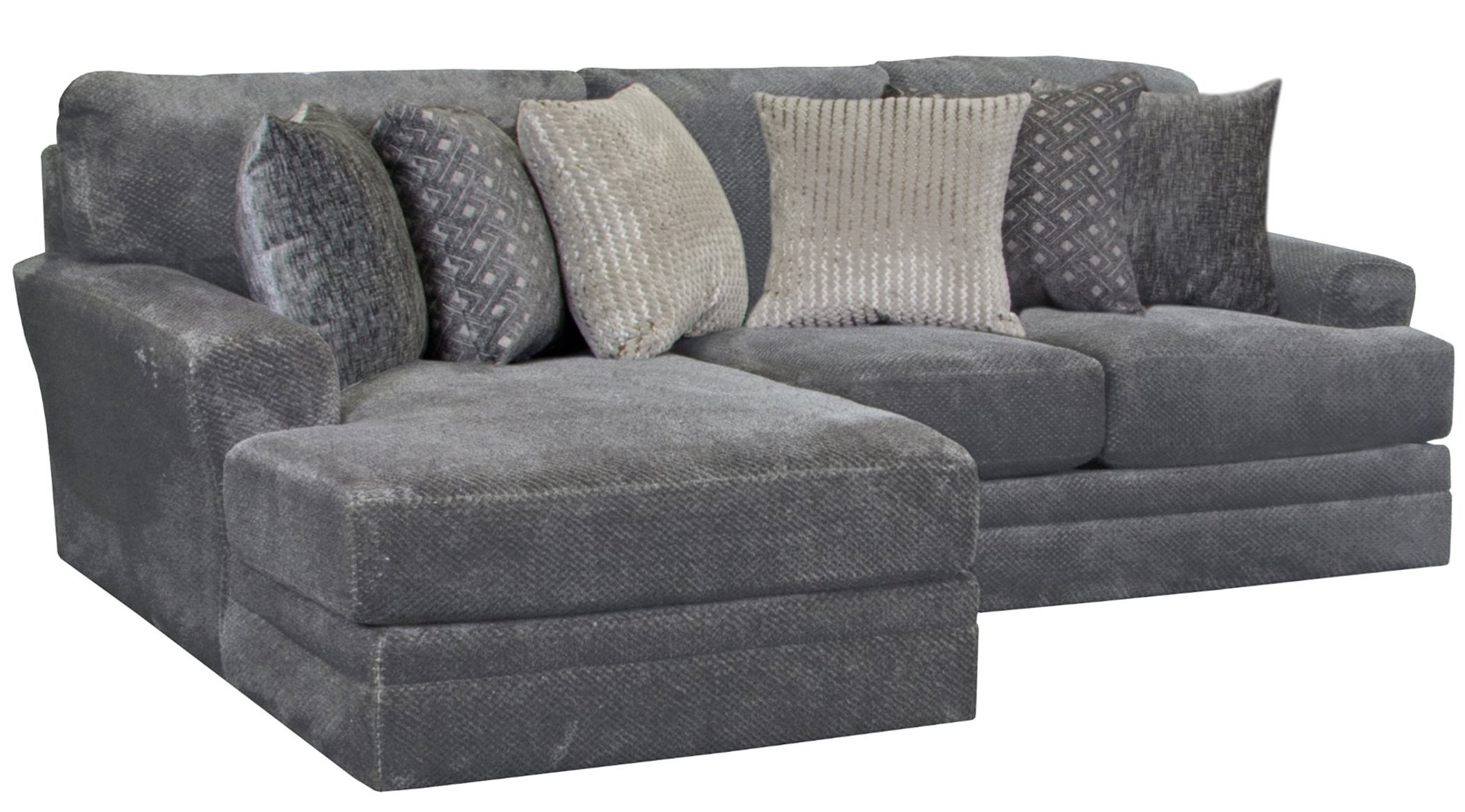 This chaise is perfect for a reading room or smaller living room. Comfort Coil Seating featuring Comfor-Gel, Eclectic Mix of Contemporary Pillows, Plush Textured Polyester Fabric and Steel Tech Framing.