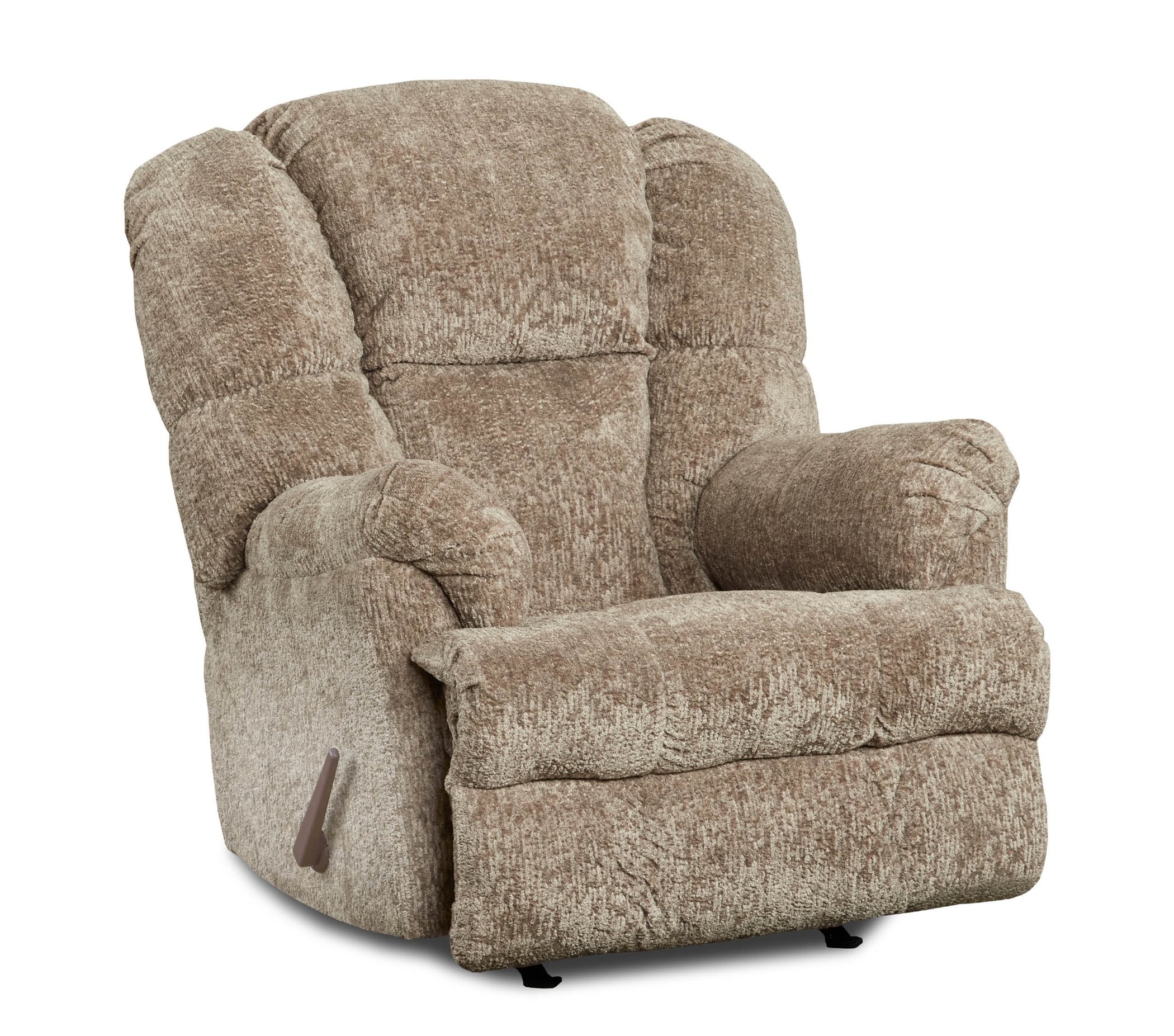 Manual rocking recliner with chenille type fabric features padded arms and wide wing back.