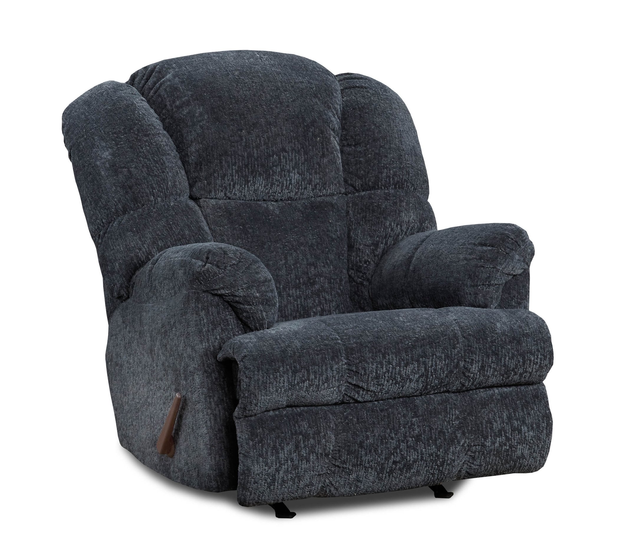 Manual rocking recliner with chenille type fabric features padded arms and wide wing back.