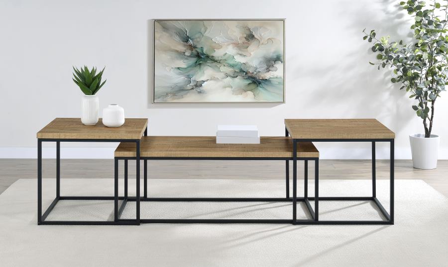 This coffee table set introduces a clean, industrial-inspired presence to the living room with its balanced mix of warm wood tone and crisp metal structure. Rectangular tops finished in a mango wood-look surface rest within slim black metal frames that create a light, open profile. Crafted with engineered wood and laminate veneer over supportive metal bases, the design keeps the look simple and grounded. The coordinated coffee table and end tables offer a cohesive centerpiece for everyday living and casual entertaining.
