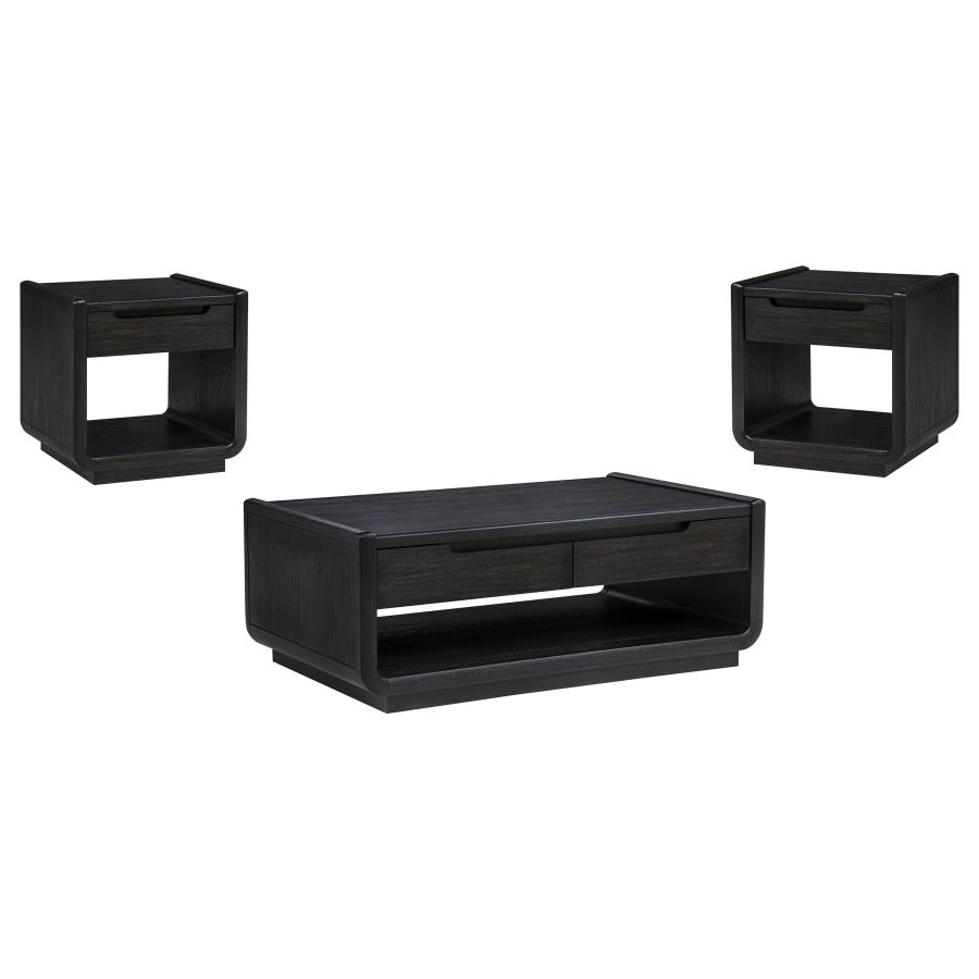 Wood coffee and end table set creates a cohesive living room layout with one coffee table and two matching end tables, each designed with softly rounded frame edges and integrated storage. Drawers keep essentials organized while open lower shelves offer accessible display space. Finished in burnished black over engineered wood and ash veneer, the coordinated tables bring rich wood texture and a refined modern presence to the room. This occasional table set balances clean structure with everyday functionality.