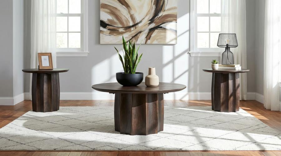 Sculptural curves meet grounded elegance in this walnut coffee table set, finished in a rich tone that enhances its bold form. Designed with matching round tops and pedestal bases, each piece balances soft silhouettes with architectural lines. Expertly crafted from solid mango wood, it offers natural texture and lasting durability. This occasional table set brings warmth, unity, and sculptural presence to any living room arrangement.