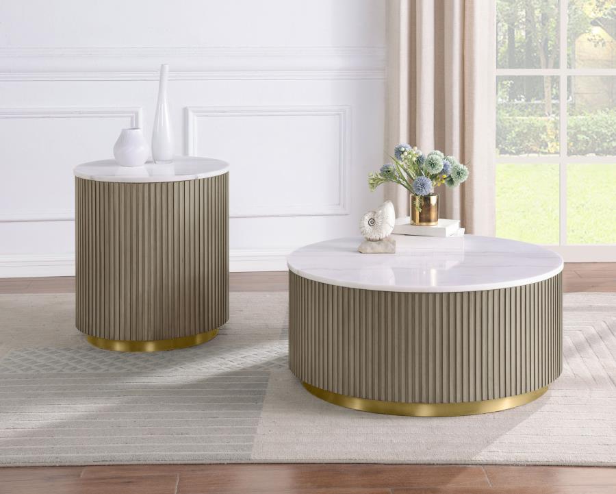 A coffee table set brings cohesive presence to a room with matching round white marble tops, reeded drum bases, and slim metal ring accents. Marble, engineered wood, and metal combine for a balanced mixed-media profile with crisp veining and clean vertical rhythm. This occasional table set creates coordinated surfaces from center to sides, keeping daily essentials close in a living space.