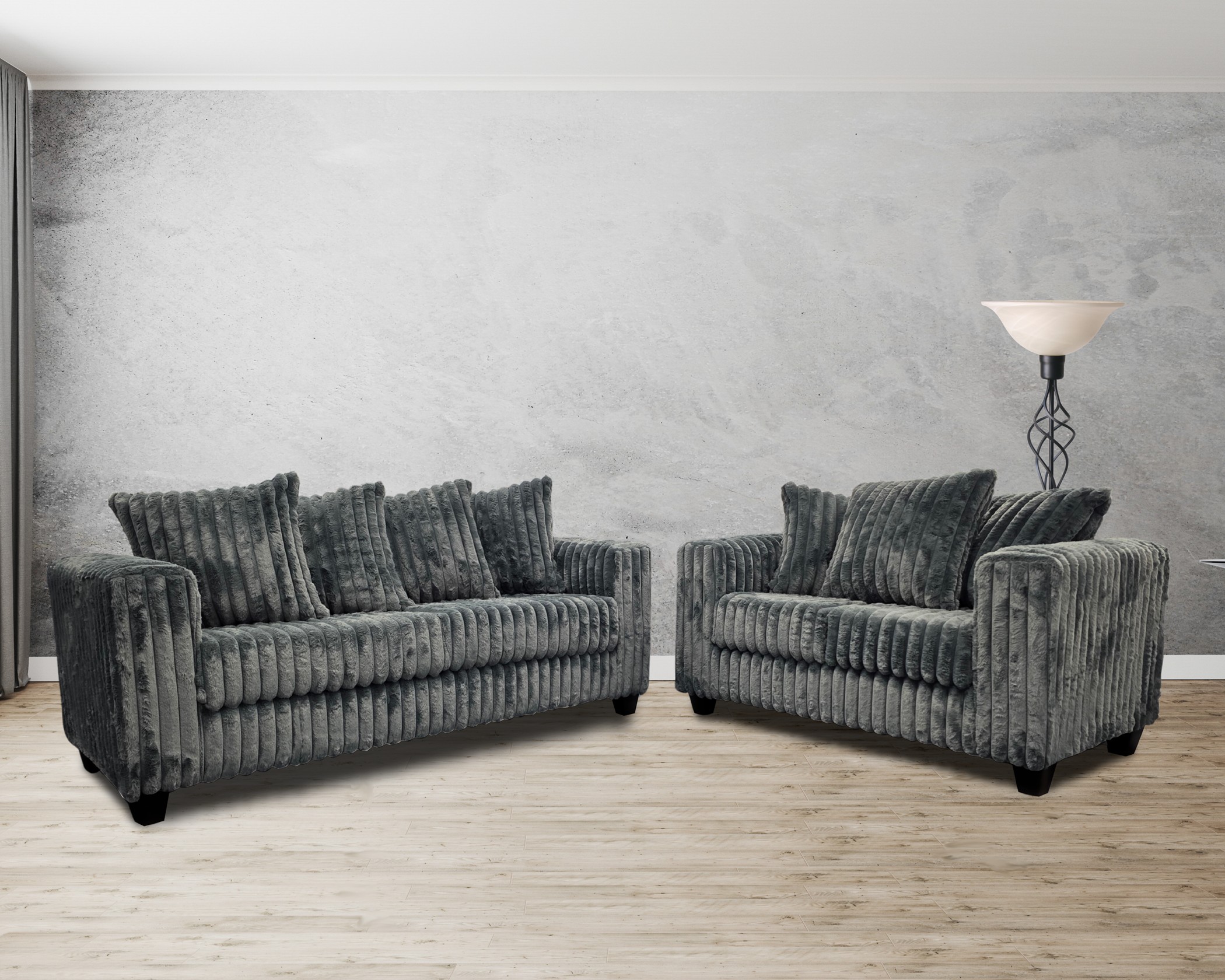 Grey sofa and loveseat with thick channel corduroy top to bottom. Feels like mink